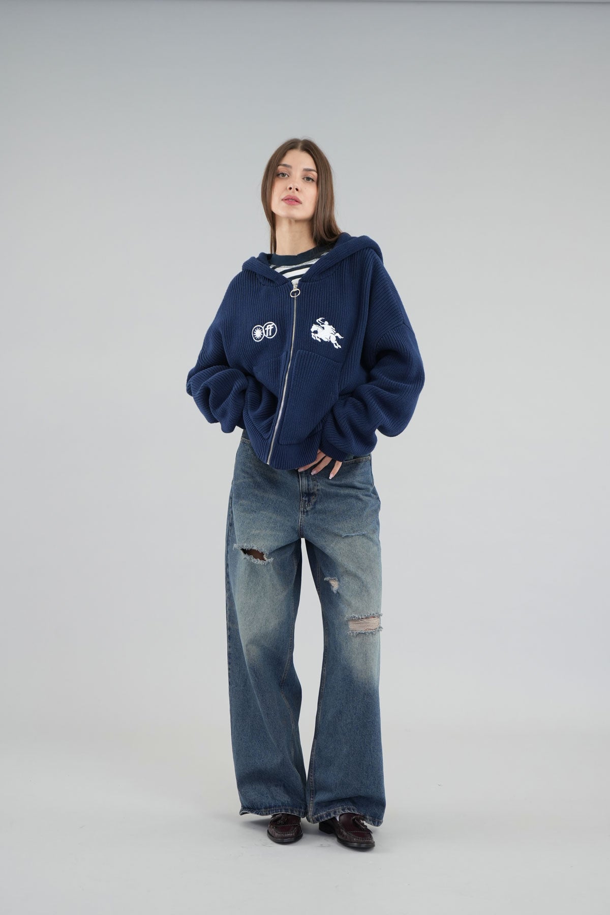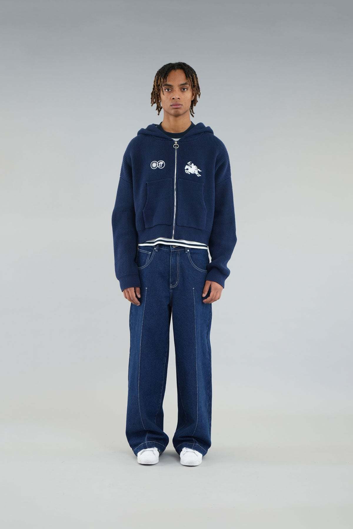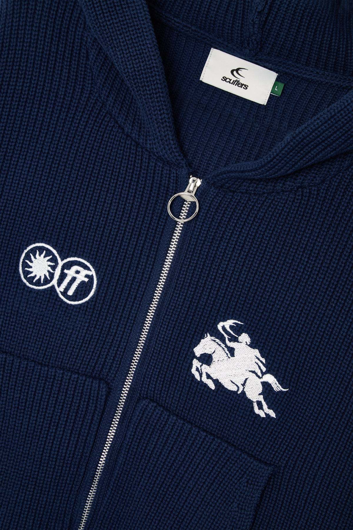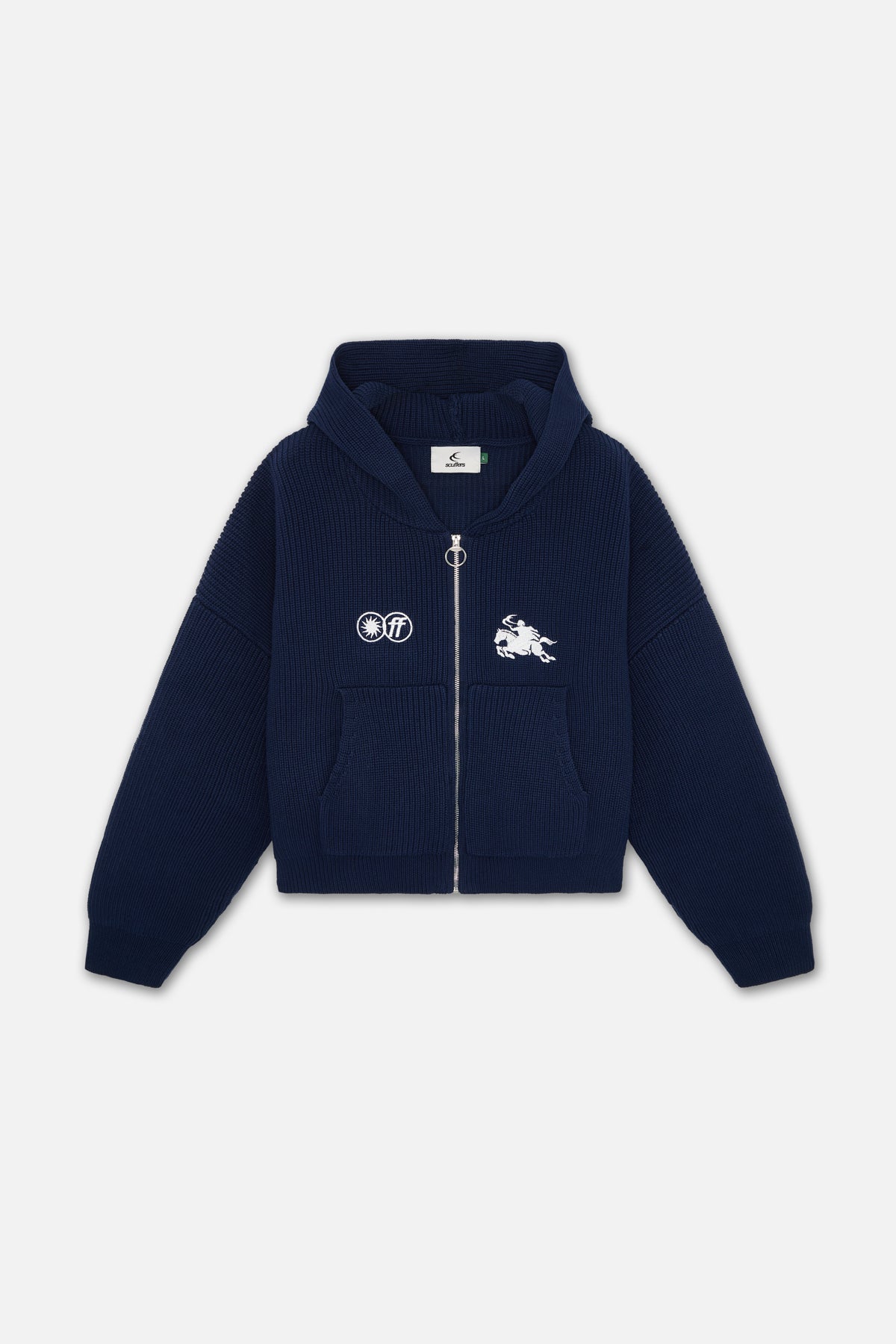 Navy knit hoodie with a front zipper and hood. It features a white embroidered Scuffers rider logo on the chest, along with two additional graphic emblems. The back displays the Scuffers logo embroidered just below the hood. This knit sweater includes kangaroo pockets and a zipper closure with a metal ring pull.