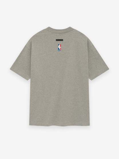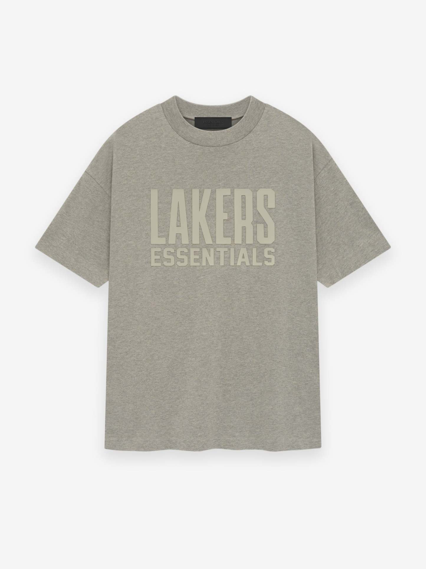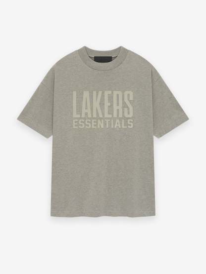 The Essentials Lakers short sleeve tee is crafted from core cotton jersey. It features a relaxed fit in the body with dropped shoulders and a rib-knit crewneck. On the front, there is a rubberized soft-touch "LAKERS ESSENTIALS" lockup, along with the iconic NBA logo on the back. Additionally, a rubberized "Essentials Fear of God" label is located at the back collar.